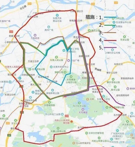 5.環城南路(莞長立交)—環城東路(崇煥立交),八一路(同沙立交)—松山湖大道(石大立交)路段,每天7:00-20:00禁止重型載貨汽車通行。