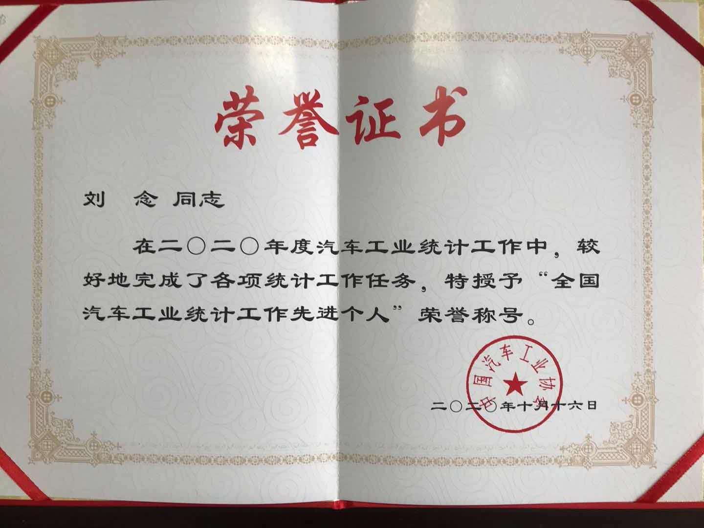 金秋十月,喜報頻傳!為弘揚統(tǒng)計工作正能量和樹立行業(yè)標桿,鼓勵在統(tǒng)計工作崗位上辛勤耕耘、默默奉獻的優(yōu)秀統(tǒng)計工作者,在中國汽車工業(yè)協(xié)會對2020年汽車工業(yè)統(tǒng)計工作先進集體及先進個人通報表彰上,我公司劉念同志榮獲“2020年度汽車工業(yè)統(tǒng)計工作先進個人”榮譽稱號,隨州僅此一人!