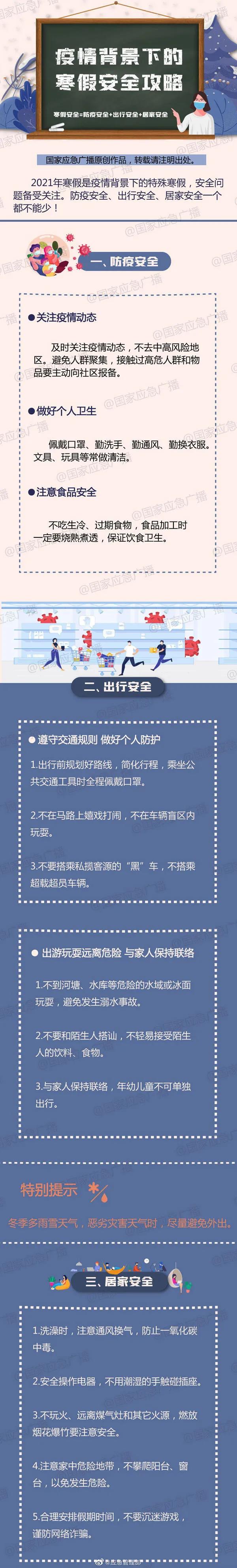 2021年寒假是疫情背景下的特殊寒假,安全問題備受關注。防疫安全、出行安全、居家安全一個都不能少!戳下圖了解↓不讓安全放假。