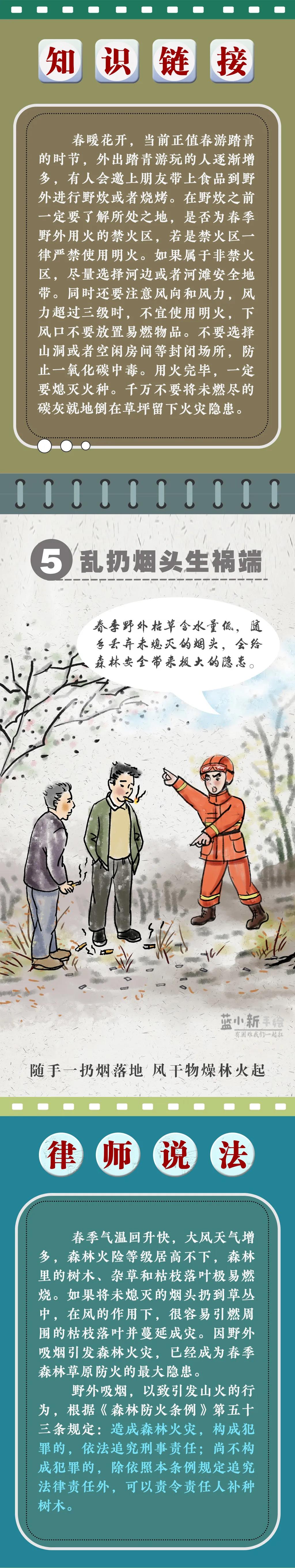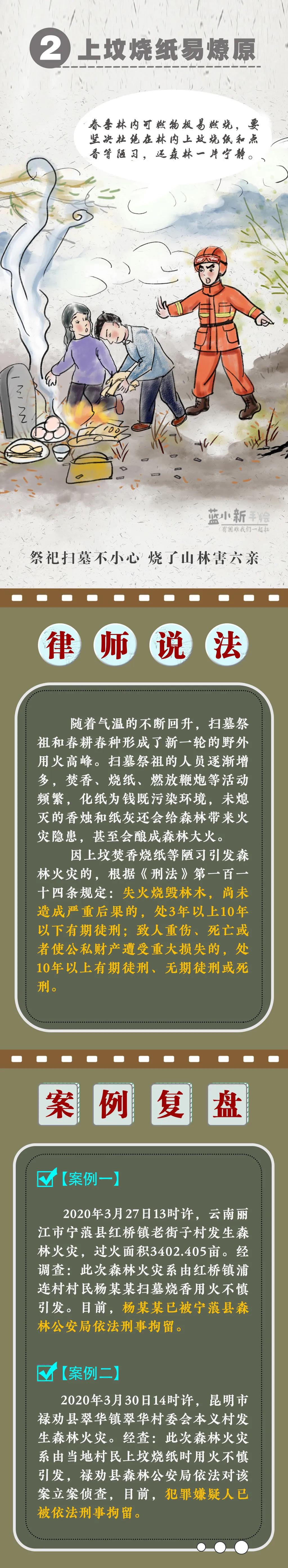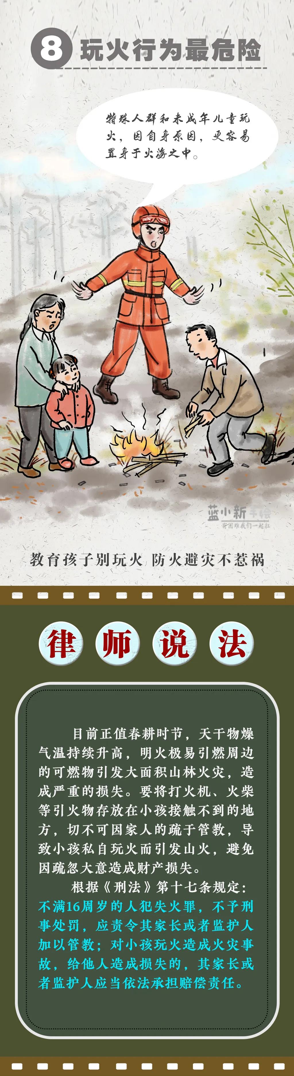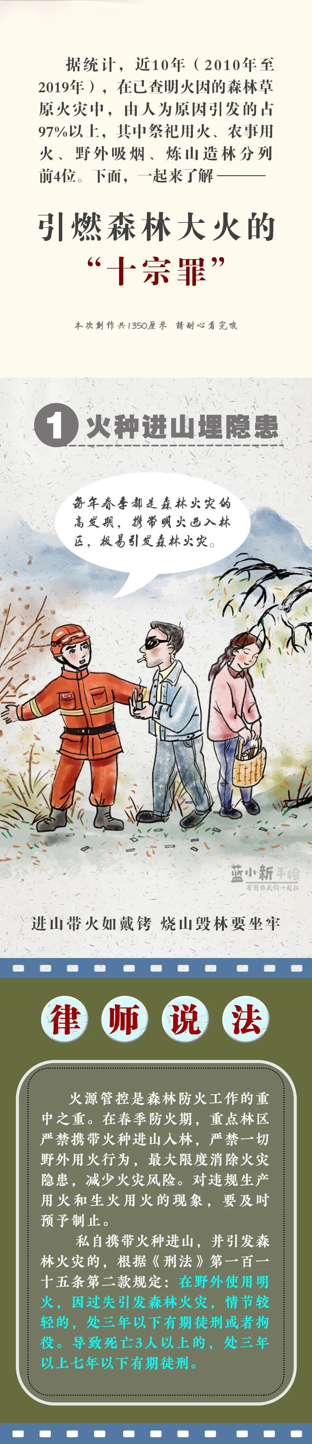 據(jù)統(tǒng)計,近10年(2010年至2019年),在已查明火因的森林草原火災(zāi)中,由人為原因引發(fā)的占97%以上,其中祭祀用火、農(nóng)事用火、野外吸煙、煉山造林分列前4位。為增強(qiáng)全社會的森林防火意識,近日新疆森林消防指戰(zhàn)員制作了1350cm的長漫,呼吁公眾野外依法文明用火,共同呵護(hù)綠色生態(tài)家園,切莫因一時疏忽,成為燒山毀林的罪人!